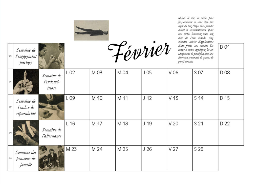 L’imaginaire du calendrier se situe sur la ligne de crête entre un discours bienveillant des collectivités (le care) et les menaces qu’elles peuvent distiller en sous-texte (autoritarisme et guerre). Il est constitué de vocabulaire institutionnel actuel et d’images (ainsi que de précieux conseils) piochées dans des magazines féminins datant des années 1940.